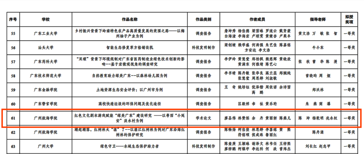 近日,第十七届 “挑战杯” 广东老员工课外学术科技作品竞赛“绿美广东”专项公布评选结果,伟德国际victor1946学术论文《红色文化剧本游戏赋能“绿美广东”建设研究--以粤西“小延安”淡水村为例》荣获省级一等奖。