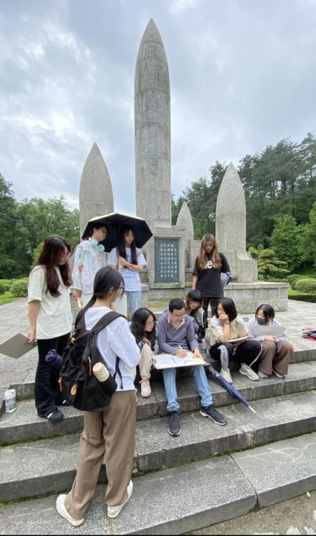 除了对沿途景点的写生创作,途中还专门前往全国爱国主义教育基地忠烈祠,了解国共在南岳的抗日作战历史。老师进行讲解,同学们认真聆听学习,并对历史建筑进行现场写生,在深入学习专业知识的同时,也融入了思政教育,使学术探索与爱国情怀同步增长。