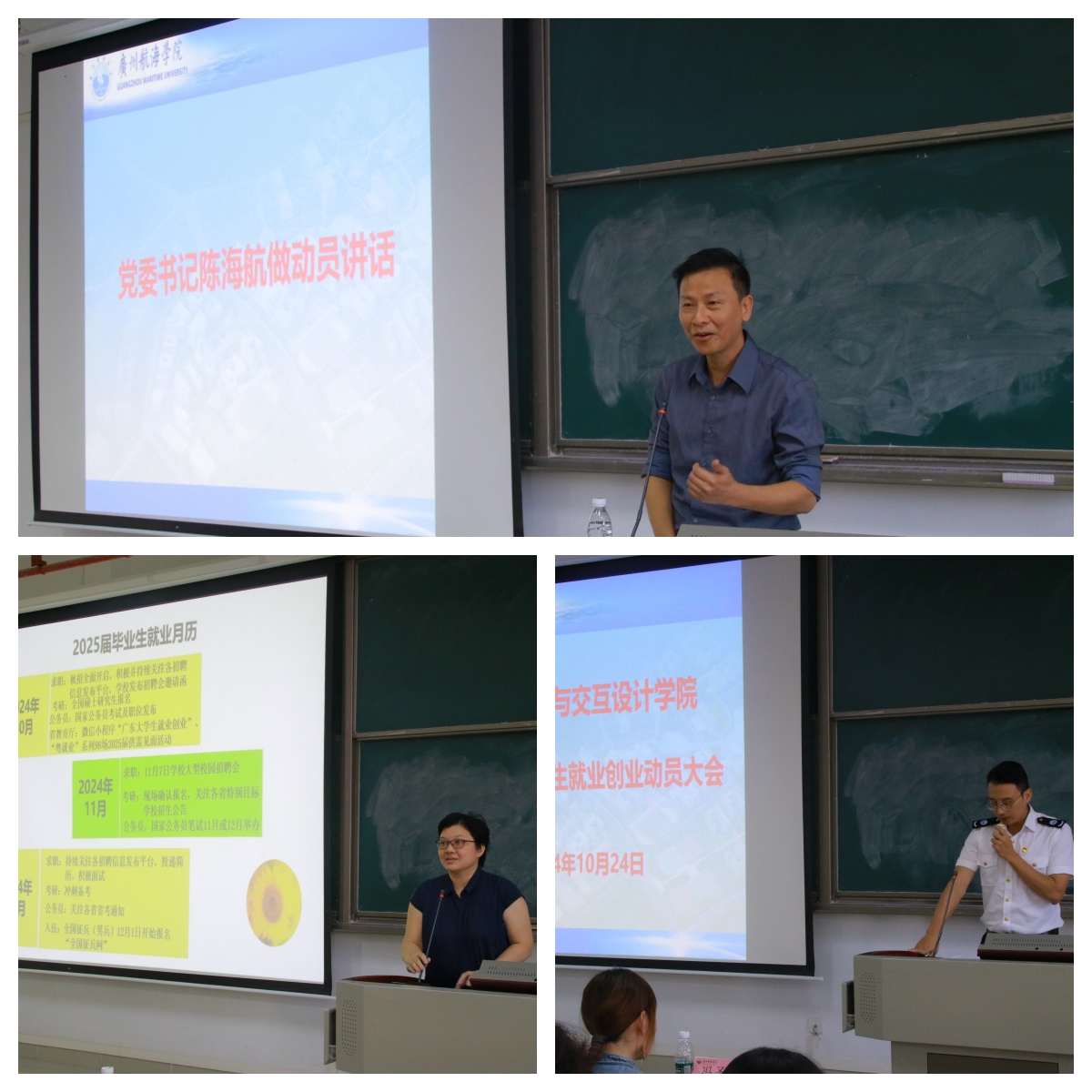 陈海航作了动员讲话。他向同学们讲解了当前的就业形势和市场需求,对大家提出希望。一要树立科学就业观主动就业。毕业生们要积极主动地走进社会,勇敢面对就业挑战,做好职业生涯规划。要依靠自己的能力求生存促发展,报答父母,为家庭、社会和母校贡献应有力量。二要不断提高综合素质和就业竞争力。希望同学们珍惜在校时光,努力学习专业知识,提高专业技能,积极参加各种学科竞赛和社会实践活动,锻炼实践能力和创新能力。要注重学习提高自身沟通能力、团队协作能力和解决问题的能力。三要坚定信心、树立锲而不舍的精神。要传承“勤学善思厚德求新”校训精神,唱响校歌“像海燕一样展翅飞翔”。就业创业过程中难免会遇到各种困难和挫折,要学会及时调整心态,以积极勇敢的态度迎接每次挑战,克服各种困难,相信通过不懈努力一定能够实现就业创业的目标。