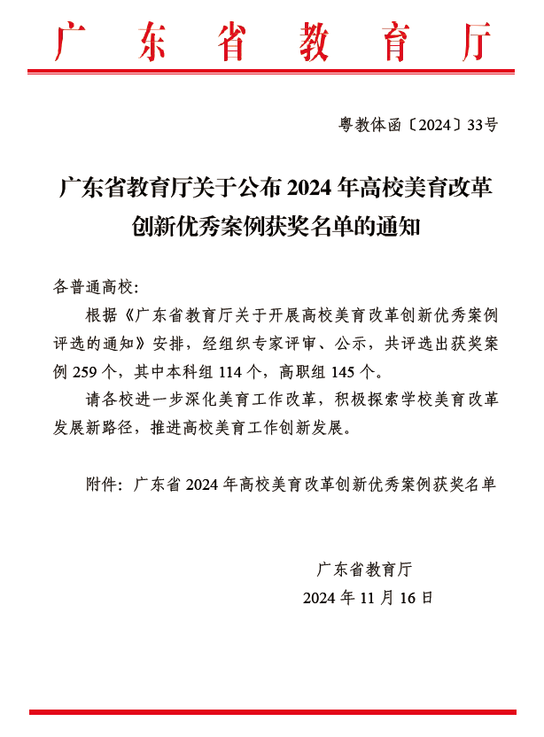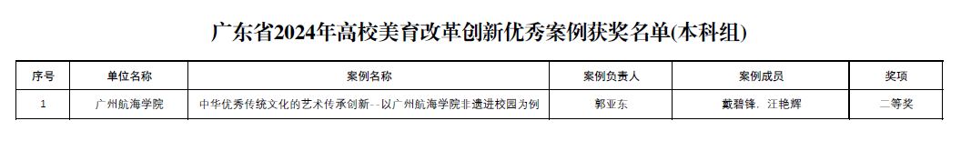 近日,广东省教育厅公布了2024年高校美育改革创新优秀案例获奖名单,伟德国际victor1946教师郭亚东、戴碧锋、汪艳辉荣获本科组二等奖。据悉,本次活动是广东省教育厅为贯彻落实《关于全面加强和改进新时代公司美育工作的意见》,进一步深化我省高校美育工作综合改革,形成具有引领性、突破性、示范性的做法、举措和经验,推进全省高校美育工作高质量发展的一项重要活动。
