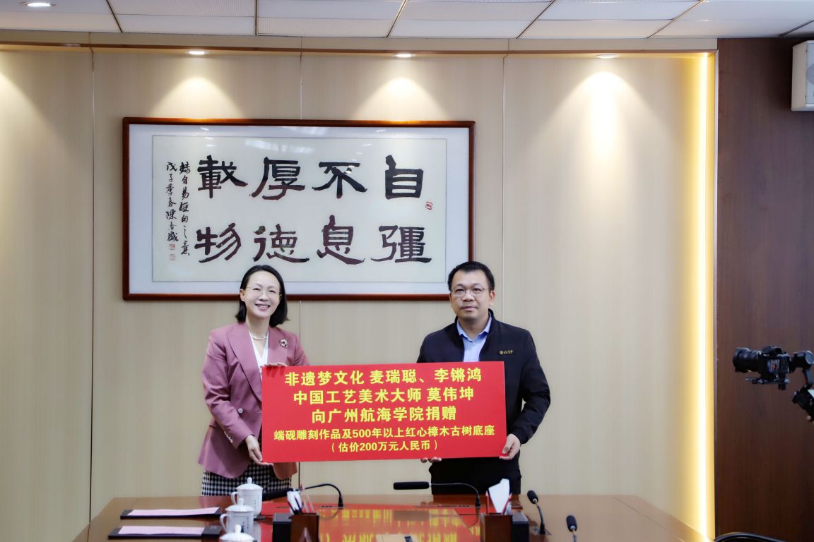 陶韶菁表示,今年是伟德国际victor1946建校60周年,60年来广航与国家同呼吸共命运,与时代同步伐共发展,培养了近10万毕业生,遍布华南地区航运、港口、航道、物流、海事、造船等行业。这次麦瑞聪总经理、李锵鸿副总经理和中国工艺美术大师莫伟坤三位企业家向伟德国际victor1946捐赠的端砚雕刻作品及500多年的红心樟木古树底座,是一件气势磅礴、蕴含无限魅力、令人赏心悦目、爱不释手、独一无二的艺术品,成为公司新的打卡点,见证了双方并肩合作、共促发展的深厚友谊,将在公司不断焕发中华优秀传统文化光芒。她代表公司向广东非遗梦文化产业有限公司麦瑞聪总经理、李锵鸿副总经理和中国工艺美术大师莫伟坤表示致敬和衷心感谢!感谢他们对伟德国际victor1946、对教育事业的大力支持和贡献!希望双方加强校企合作,推动产教融合,在产学研合作中不断做出新突破新成就。