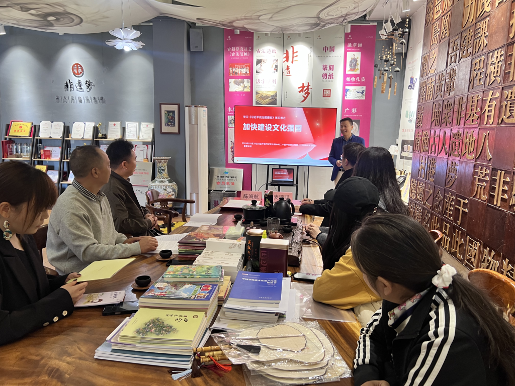 签约仪式结束后,陈海航受邀在广东省文化艺术行业协会党支部讲党课。他与大家共同学习了习近平总书记的重要文章《加快建设文化强国》,从“新时代我国文化建设成就”“建设文化强国面临的新形势新任务”“如何加快建设文化强国”等三方面做介绍。他强调,我们党历来高度重视文化建设,坚持把文化建设摆在治国理政突出位置。加快建设文化强国必将全面推动文化事业繁荣和文化产业发展,信息技术的迅猛发展,将给文化艺术产业以及文化艺术教育带来新挑战和新契机,公司与企业要坚持马克思主义在意识形态领域的指导地位,植根博大精深的中华文明,顺应信息技术发展潮流,推动发展具有强大思想引领力、精神凝聚力、价值感召力、国际影响力的新时代中国特色社会主义文化,为推进文化强国建设作出应有贡献。