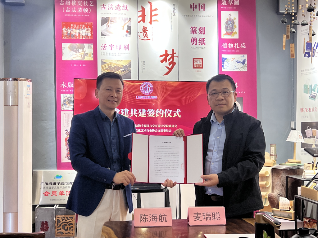 11月28日下午,公司党委与广东省文化艺术行业协会党支部在广东非遗梦文化产业有限公司举行党建共建签约仪式。广东省文化艺术行业协会党支部书记、广东非遗梦文化产业有限公司总经理麦瑞聪、公司党委书记陈海航、经理邓焱,副经理戴碧锋、数媒艺术系党支部书记冯圣媖等出席仪式。