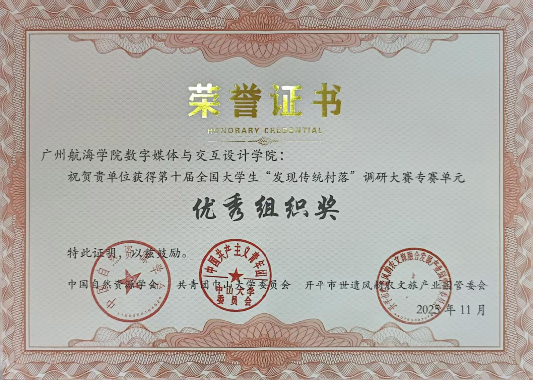 本次大赛由中国自然资源学会、共青团中山大学委员会、开平市世遗风情文旅产业园区管委会联合主办,以传统村落保护活化、助力城乡融合发展为核心主题,吸引全国多所高校师生踊跃参与。赛事期间,公司高度重视、精心部署,高效统筹师生开展调研实践,在作品筹备、申报报送等全流程中展现出专业严谨的组织能力,凭借扎实的工作成效赢得大赛组委会认可。