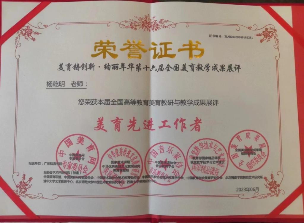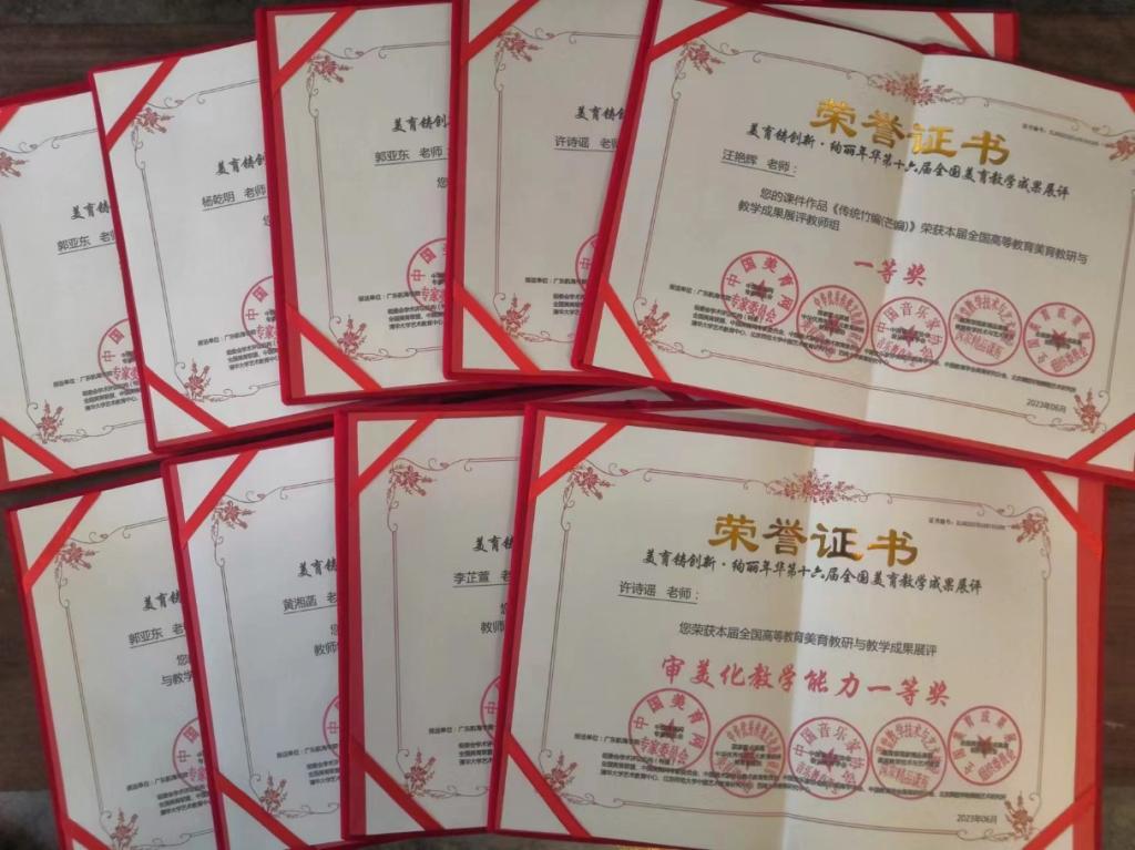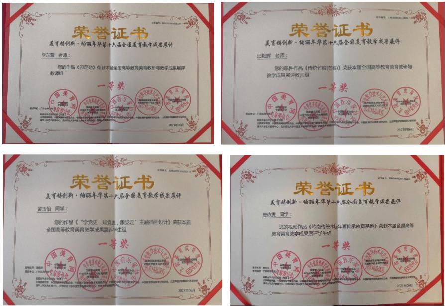 伟德国际victor1946在此次参评中硕果累累,获得两项集体成果奖:“单位荣获全国高校美育工作先进单位”“全国高校美育教学优异成果奖”;15项教师个人奖,其中杨乾明经理荣获“全国高校美育先进工作者”,郭亚东、汪艳辉、许诗谣、李芷萱老师分别荣获“全国高校优秀指导教师奖”“创意创新奖”“教学成果一等奖”“审美化教学能力一等奖”等;员工获奖22项,其中作品一等奖5项、二等奖10项,视频一等奖2项、二等奖5项。