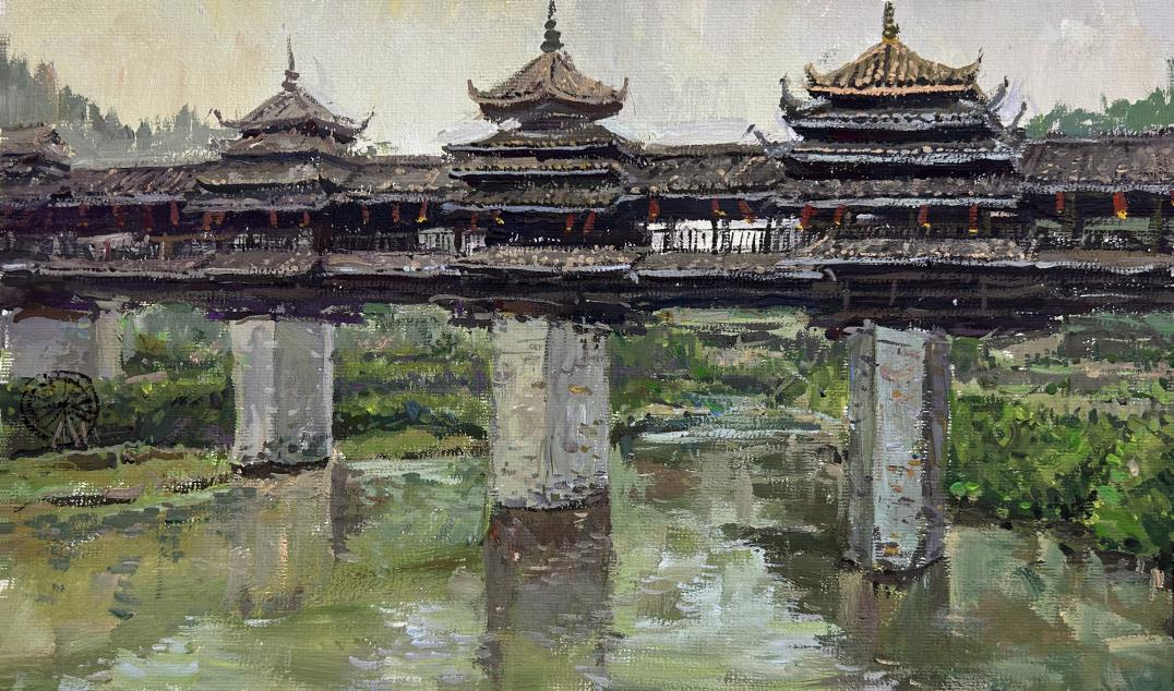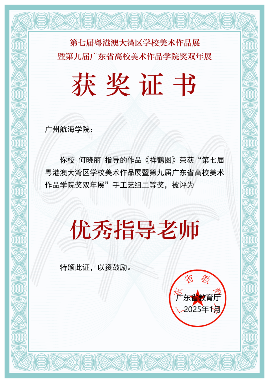 员工组竞赛中,广航学子以青年视角融合传统与现代,展现了扎实的专业素养与创新思维,表现突出,斩获多项殊荣。张玮芯的手工艺作品《祥鹤图》,将现代衍纸工艺与传统国画审美相融合,栩栩如生的仙鹤图案寓意吉祥美好,荣获手工艺组二等奖;何昊阳的水彩作品《侗乡风雨桥》以灵动的笔触和丰富的色彩层次,展现了三江侗族风雨桥的建筑美感与深厚的文化底蕴,荣获水彩组三等奖;谢森如的《繁花》则通过衍纸工艺来表现少数民族特有的花卉图案,获得手工艺组三等奖。值得一提的是,凭借对《祥鹤图》的悉心指导,何晓丽还荣获了大赛颁发的“优秀指导老师奖”,充分展现了广航师生在艺术创作上的深厚功底与创新精神。