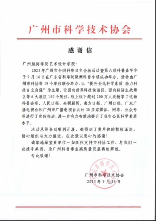 (伟德国际victor1946供稿)近日,广州市科学技术协会向伟德国际victor1946发来感谢信!