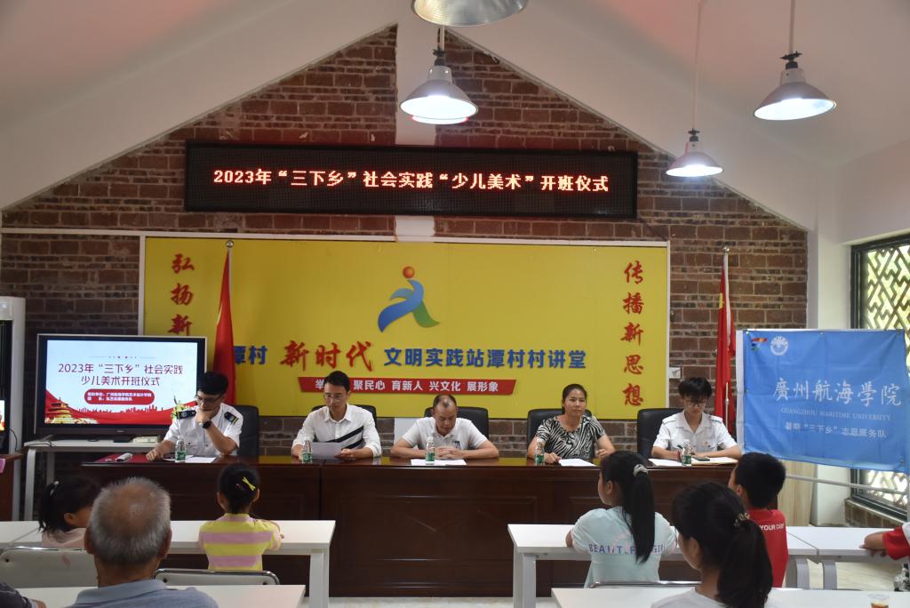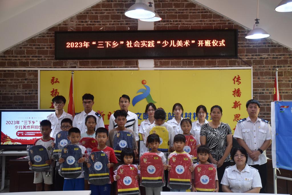7月10日,2023年“三下乡”社会实践“少儿美术培训班”开班仪式在潭村新时代文明实践分站举行。潭村村支书陈瑞站、村委干部许玉琦、指导教师冼永权、服务队成员、潭村儿童及其家长参加了开班仪式。开班仪式上队长骆怡萍同学介绍了美术培训班的背景、目的、弘艺志愿服务队往届三下乡志愿活动经验和计划。主教老师林子龙同学介绍本次培训班的课程设置和教学安排,成员郑巧宏同学分享自身经历激励孩子们对艺术的兴趣。潭村村委干部许玉琦致辞,她对服务队的三下乡实践活动表示热烈欢迎和支持,对培训班和授课老员工们表示期待,同时对孩子们寄予了希望。指导老师冼永权详细讲解了服务队的过往支教经验,介绍了团队成员的作品集,并对成员提出了希望和要求。会上举行了爱心物品捐赠仪式。潭村村委干部许玉琦、指导老师冼永权向潭村留守儿童们派发学习资料包,鼓励孩子们要好好学习,增强本领,努力成长为报效祖国的栋梁之材。